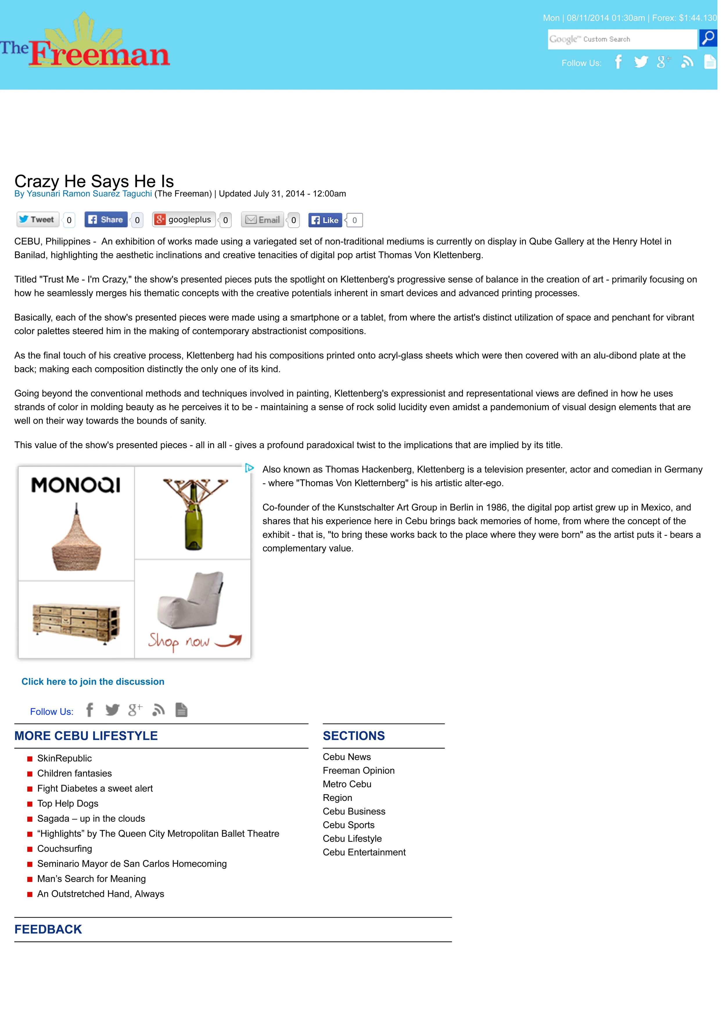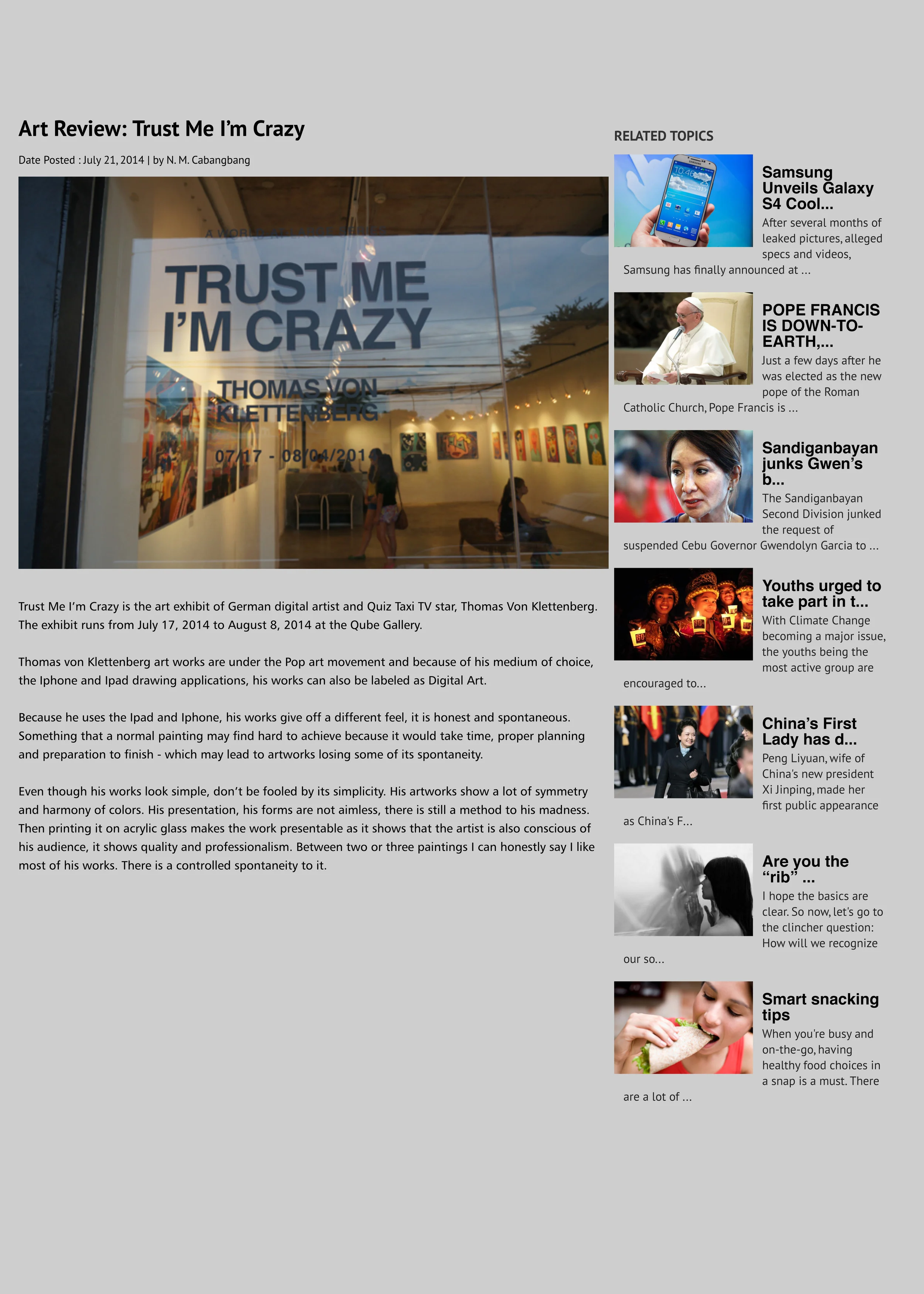 Trust Me - I’m Crazy brings to life recognizable imagery, drawn from the artist’s journey, engagements and interactions with various personalities at various points in time, contexts and places. Inspired by Pop Art and Comics, Thomas Von Klettenberg’s digital art are bright and shining — truly a celebration of life in all its diversity and colors. Who would have thought of bringing fragile pieces of art works from a foreign land? Who would have imagined that digitally finished images from the popular gadgets of iPhone and iPad be printed on acrylic-glass? Who would have imagined that digital art is before everyone’s eyes here, perhaps tickling the audiences’ mind to conceive of how the tedious process commences and ends on the walls of the Qube Gallery.